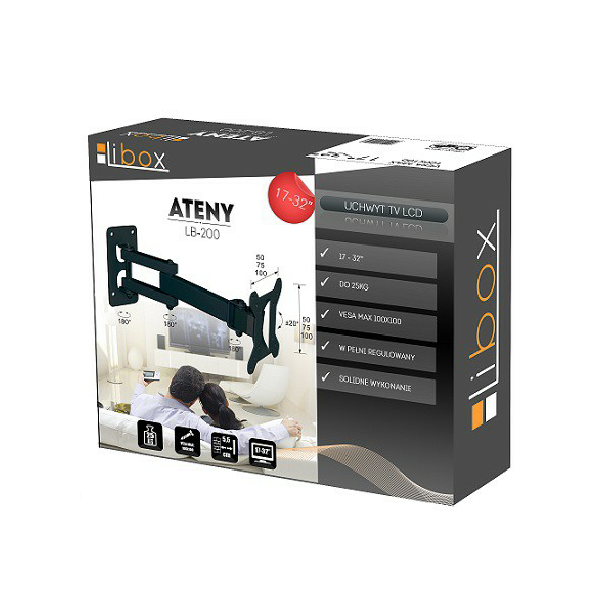 Uchwyt do telewizora ATENY LB-200 LIBOX to wysokiej jakości, stalowy uchwyt ścienny do telewizorów i monitorów LCD/LED o przekątnej ekranu od 17 do 32 cali. Dzięki nowoczesnej konstrukcji, uchwyt pozwala na powieszenie telewizora w odległości zaledwie kilku cm od ściany. Maksymalny ciężar telewizora to 25 kg. Wszystkie uchwyty LIBOX zawierają komplet śrub montażowych oraz instrukcję montażu w języku polskim.