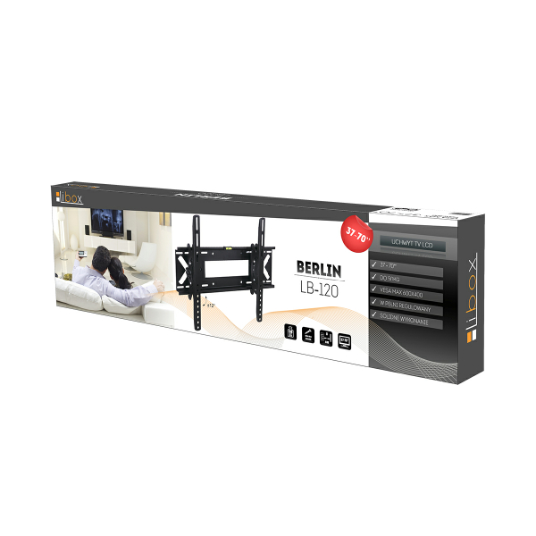 Uchwyt do telewizora BERLIN LB-120 LIBOX to wysokiej jakości, stalowy uchwyt ścienny do telewizorów i monitorów LCD/LED o przekątnej ekranu od 37 do 70 cali. Dzięki nowoczesnej konstrukcji, uchwyt pozwala na powieszenie telewizora w odległości zaledwie kilku cm od ściany. Maksymalny ciężar telewizora to 50 kg. Wszystkie uchwyt LIBOX zawierają komplet śrub montażowych oraz instrukcję montażu w języku polskim.
