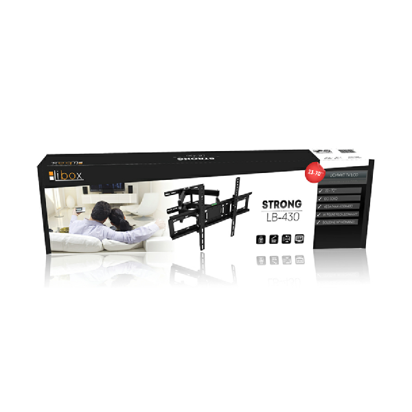 Uchwyt do telewizora STRONG LB-430 LIBOX to wysokiej jakości, stalowy uchwyt ścienny do telewizorów i monitorów LCD/LED o przekątnej ekranu od 23 do 70 cali. Dzięki nowoczesnej konstrukcji, uchwyt pozwala na powieszenie telewizora w odległości zaledwie kilku cm od ściany. Maksymalny ciężar telewizora to 50 kg. Wszystkie uchwyty LIBOX zawierają komplet śrub montażowych oraz instrukcję montażu w języku polskim.