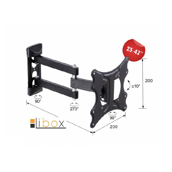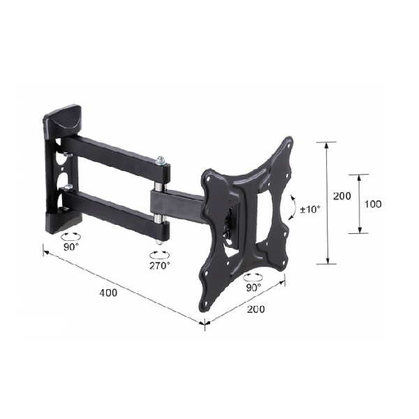 maksymalny udźwig: 25 kg pasuje do telewizorów o przekątnej ekranu od 23" do 42" - VESA max: 200 x 200 [mm] odległość od ściany: 10 cm możliwość obrotu przy ścianie o 90 stopni możliwość obrotu na środkowym przegubie o 270 stopni regulacja kąta góra-dół o 10 stopni kolor czarny (uchwyt malowany proszkowo)