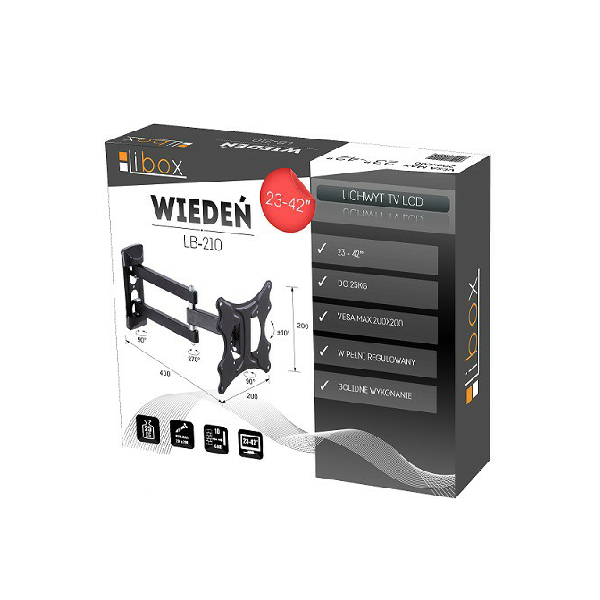 Uchwyt do telewizora WIEDEŃ LB-210 LIBOX to wysokiej jakości, stalowy uchwyt ścienny do telewizorów i monitorów LCD/LED o przekątnej ekranu od 23 do 42 cali. Dzięki nowoczesnej konstrukcji, uchwyt pozwala na powieszenie telewizora w odległości zaledwie kilku cm od ściany. Maksymalny ciężar telewizora to 25 kg. Wszystkie uchwyty LIBOX zawierają komplet śrub montażowych oraz instrukcję montażu w języku polskim.